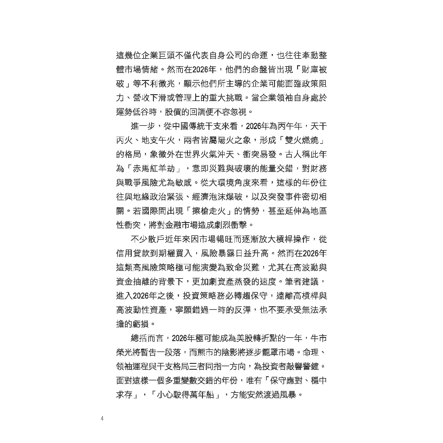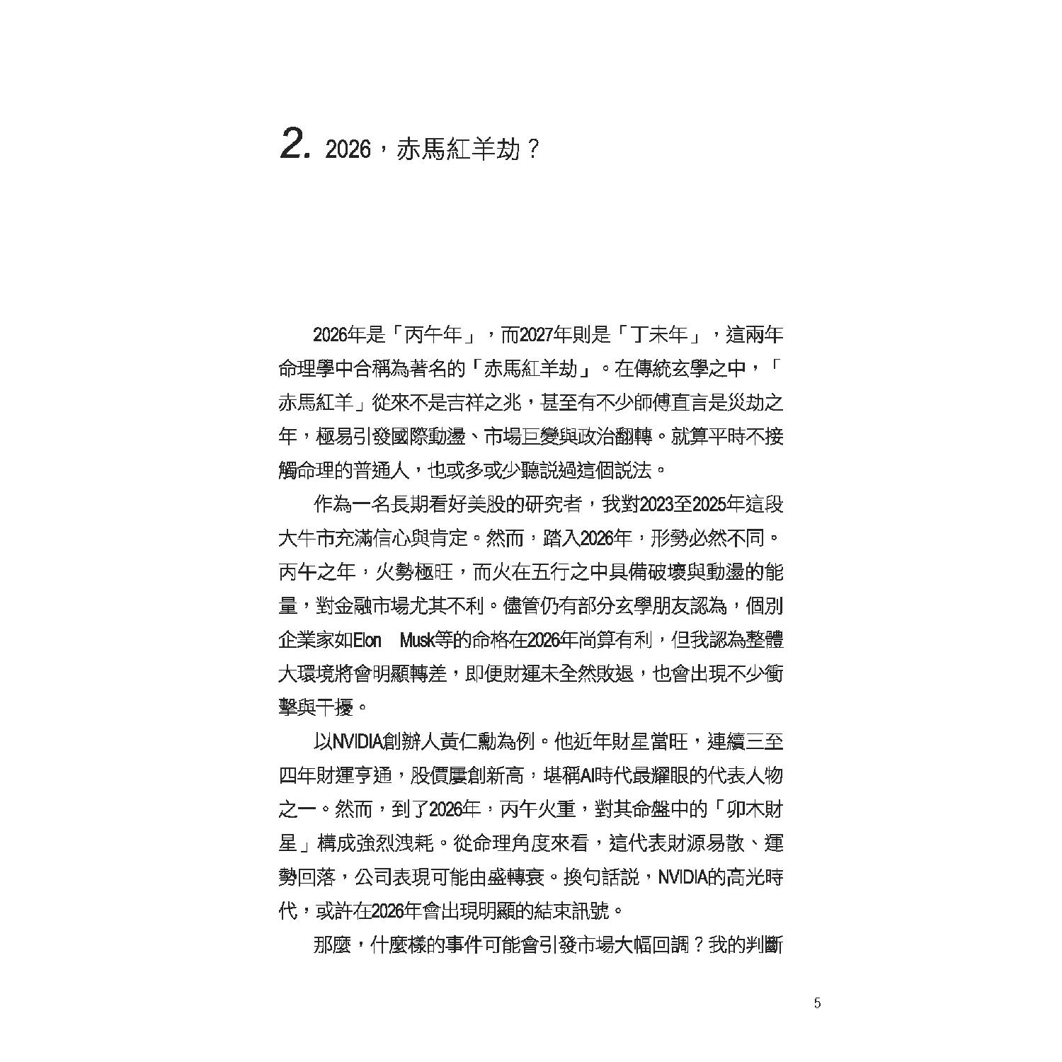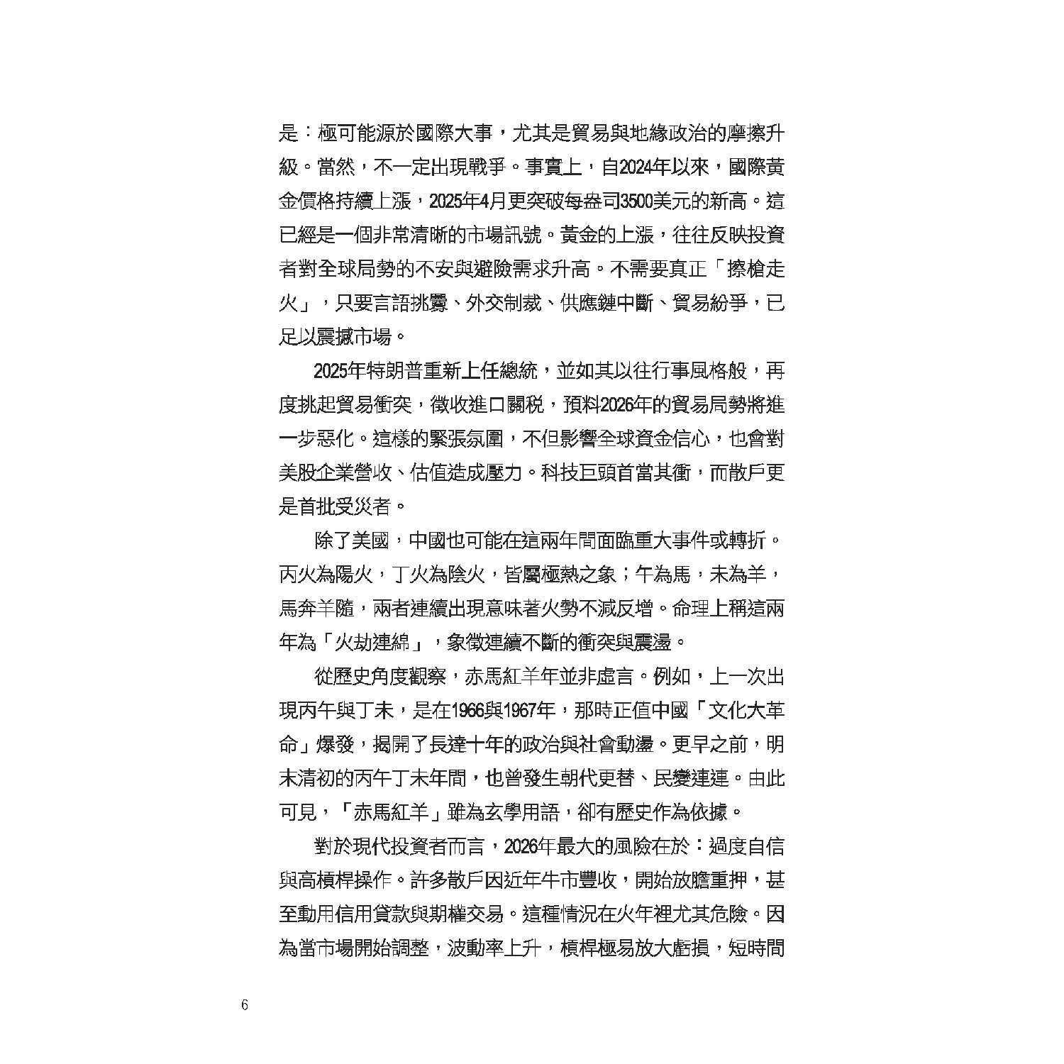 2026年丙午火年,「火劫連綿」,象徵金融動盪、地緣衝突與資產破耗之象。大市轉熊,槓桿者必傷。面對資金退潮與政治不穩,謹記「現金黃金為王」,方可守得雲開。本書並提供詳細流月指引與避險策略,指點何時減倉、何時觀望、何時低接。