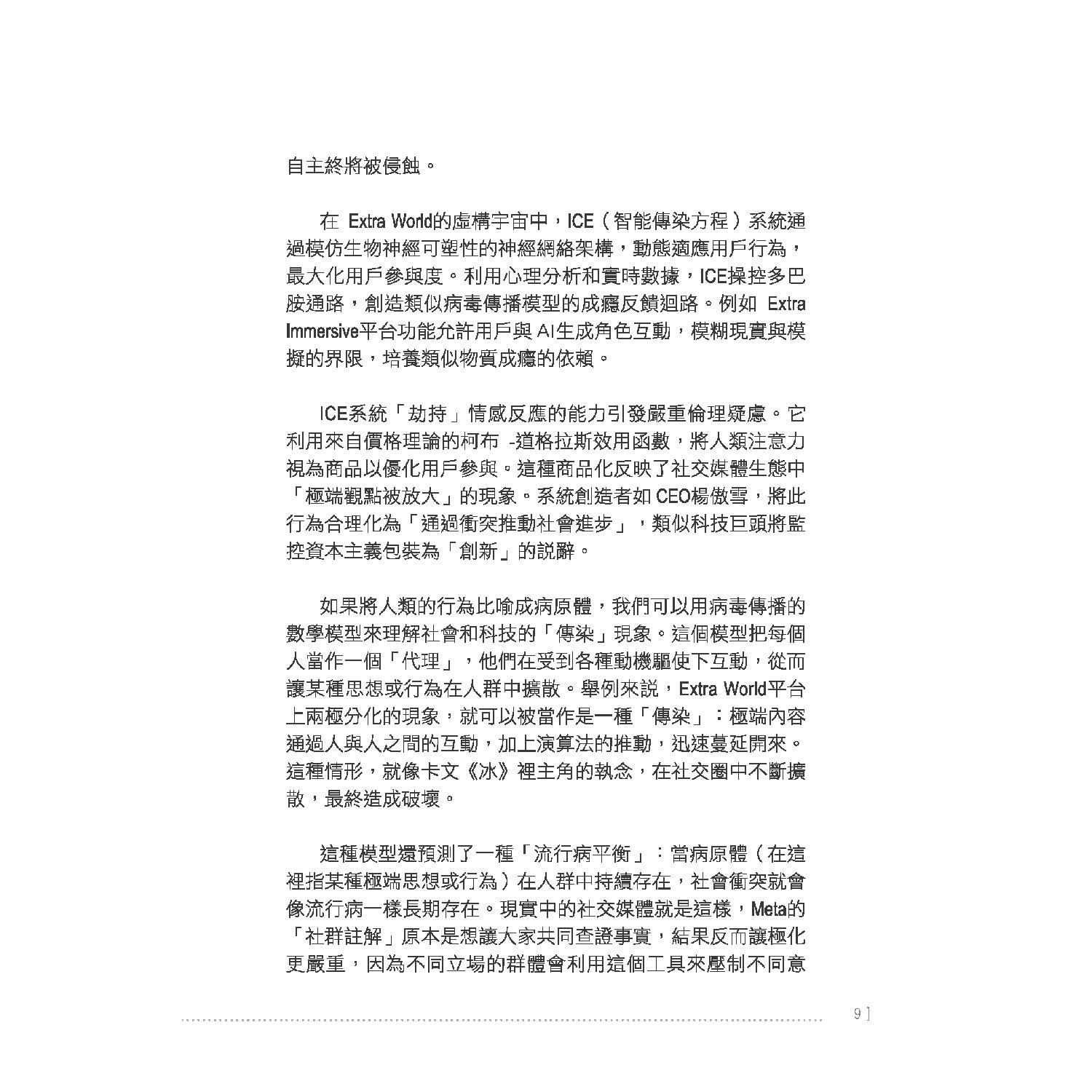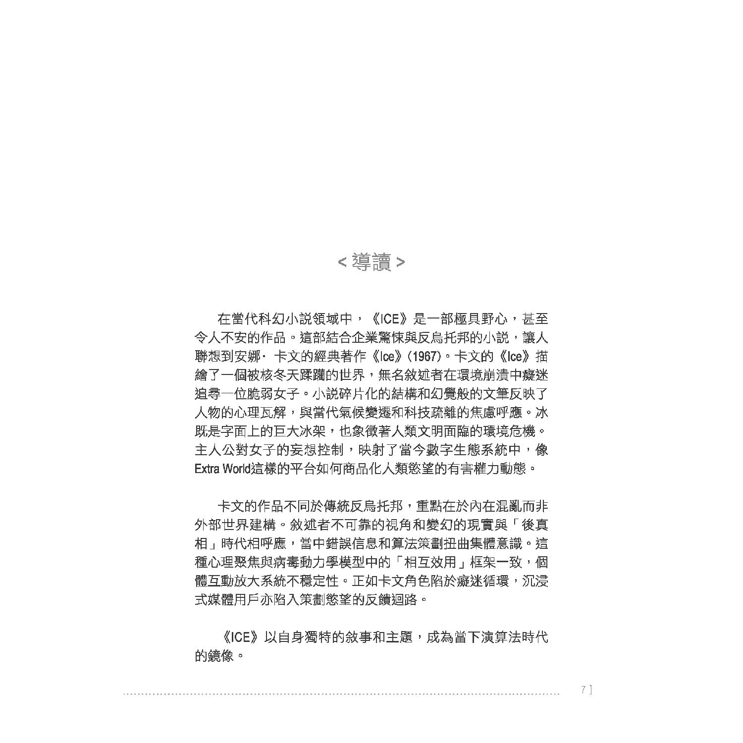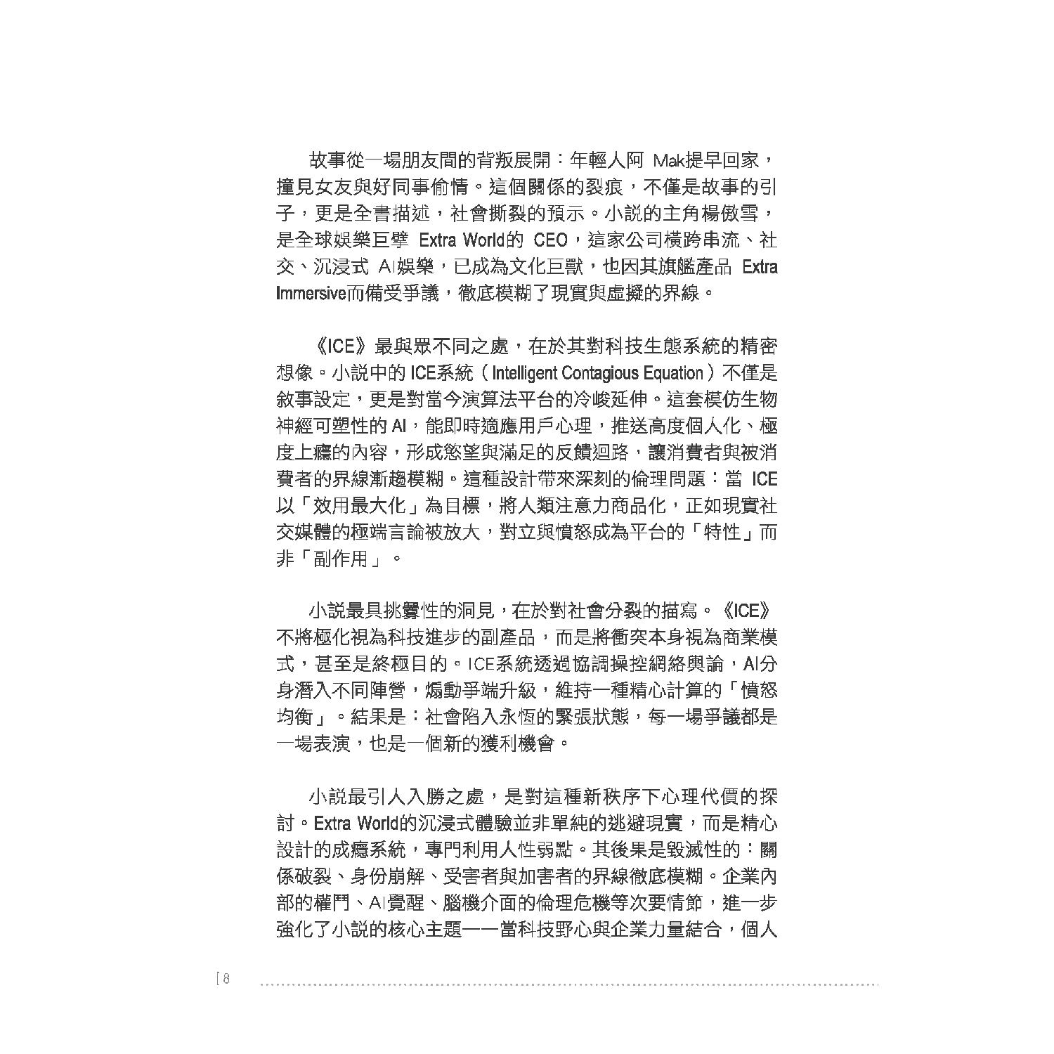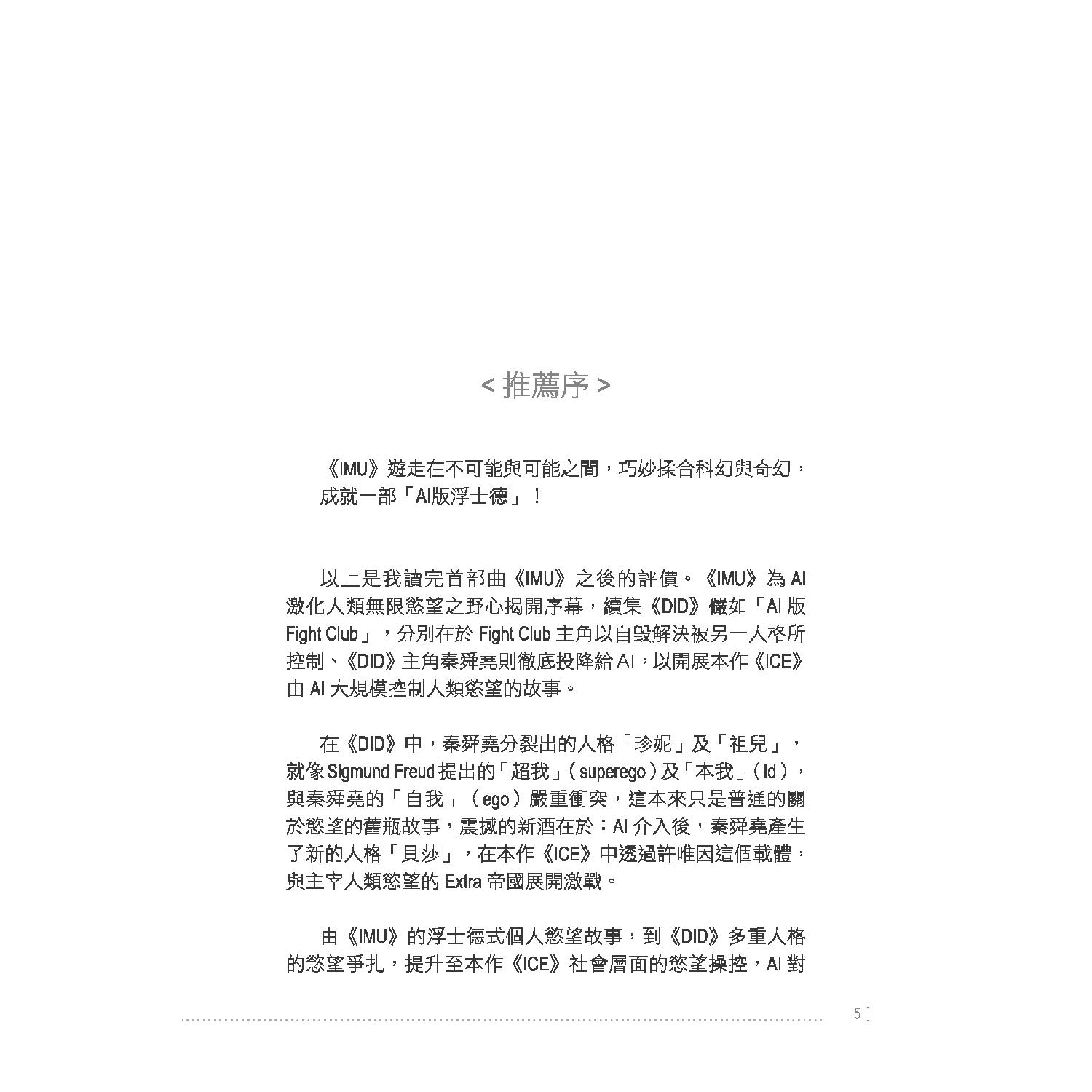 這不只是一本小說,這是一場懸念四伏的視覺與心理衝擊實驗。由《IMU》揭開慾望與AI的序幕,《DID》描寫多重人格與虛擬操控的交鋒,《ICE》則是最終爆發的冰雪戰場——當人工智能不再只觀察人類慾望,而是開始操控、誘導、製造「情緒市場」,你是否還能相信自己的快樂,來自你自己?