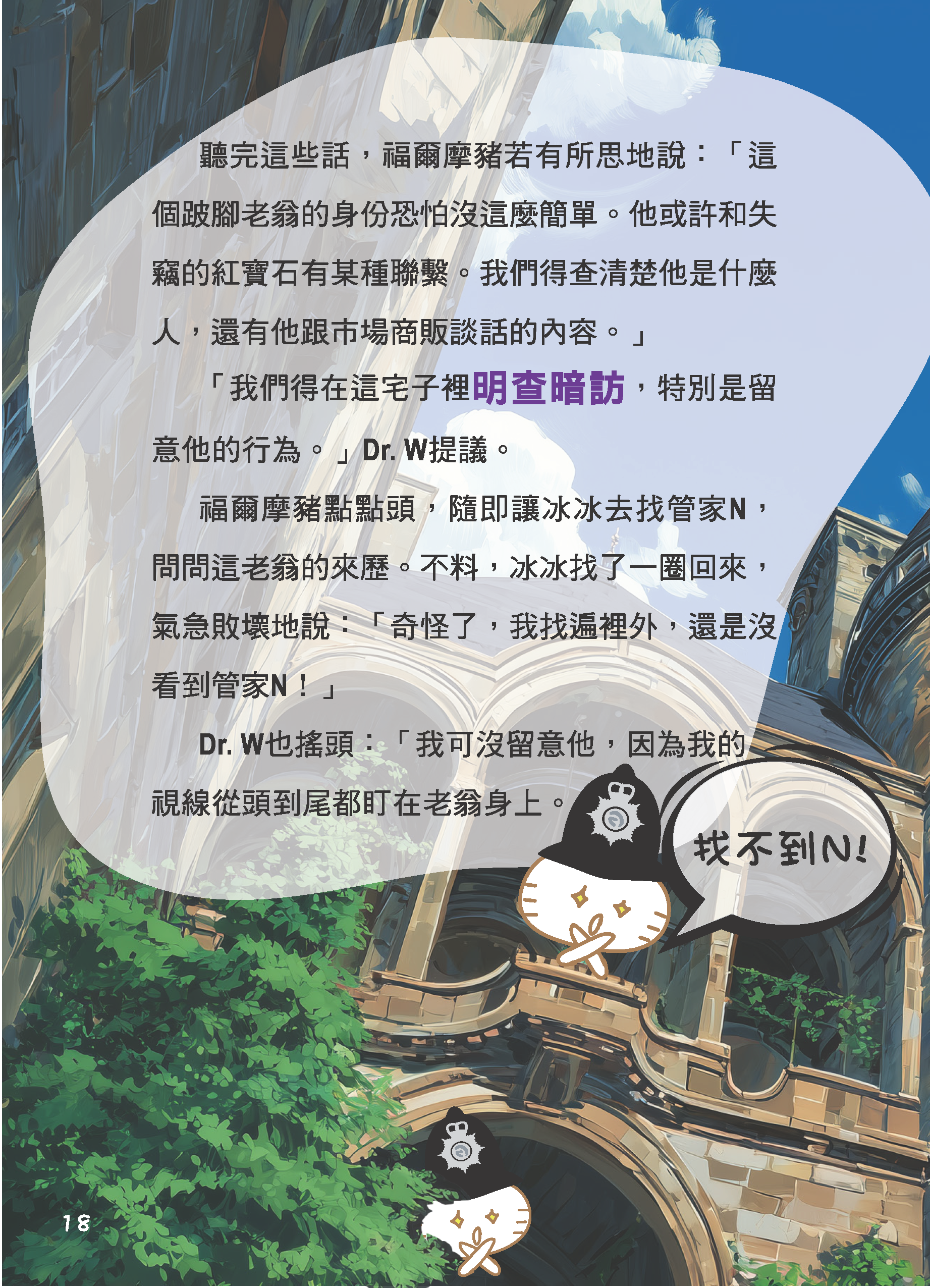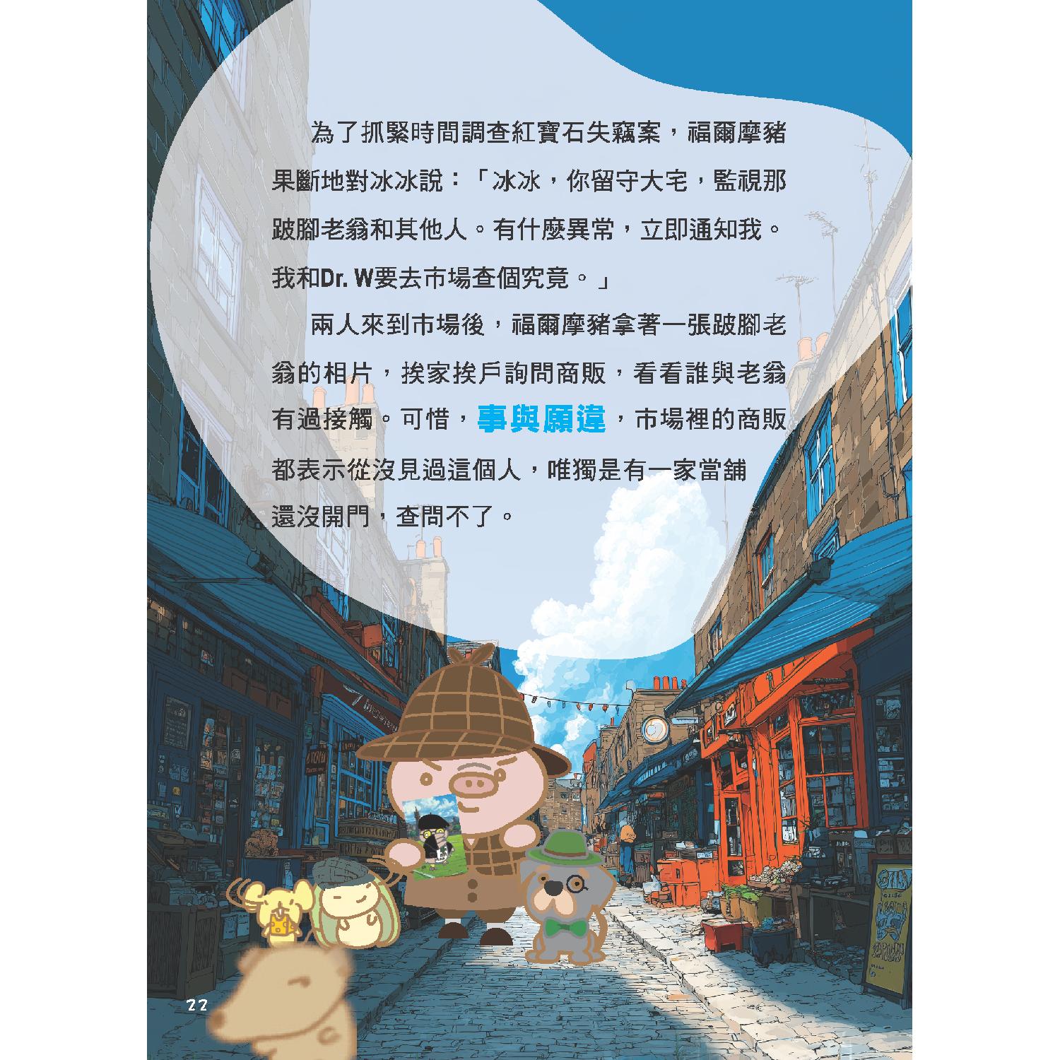 紅寶石失竊、神秘老翁現身、管家突然失踪,豪宅裡的節日氣氛,由福爾摩豬推開大門的那刻起,一切瞬間變得疑雲重重。明明是貴族派對,卻出現了拐著腳、衣著寒酸的怪客;明明是最得主子信任的管家,卻在關鍵時刻消失得無影無蹤。究竟,這是一場設計精密的失竊案,還是一場精巧的多重身份佈局?