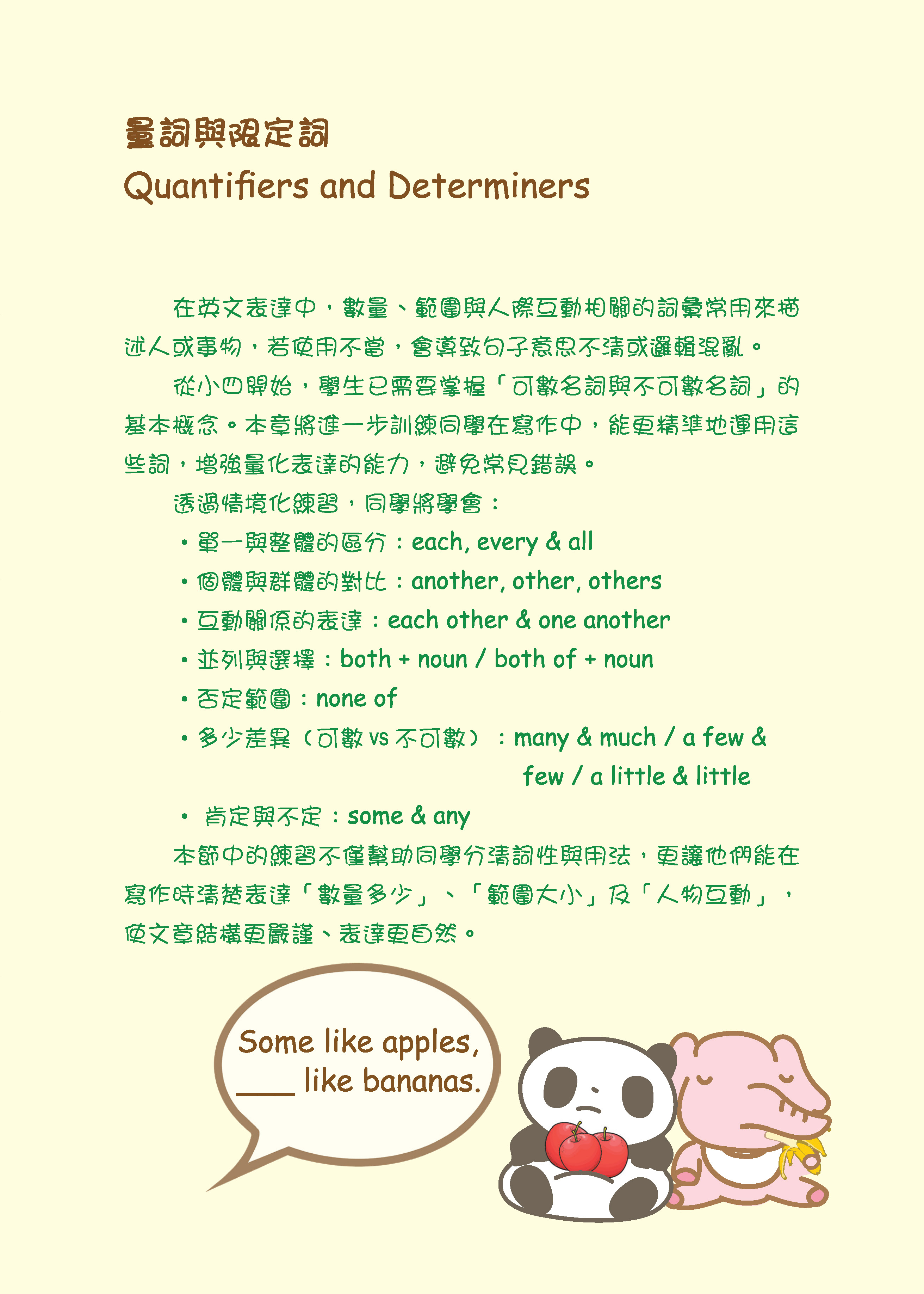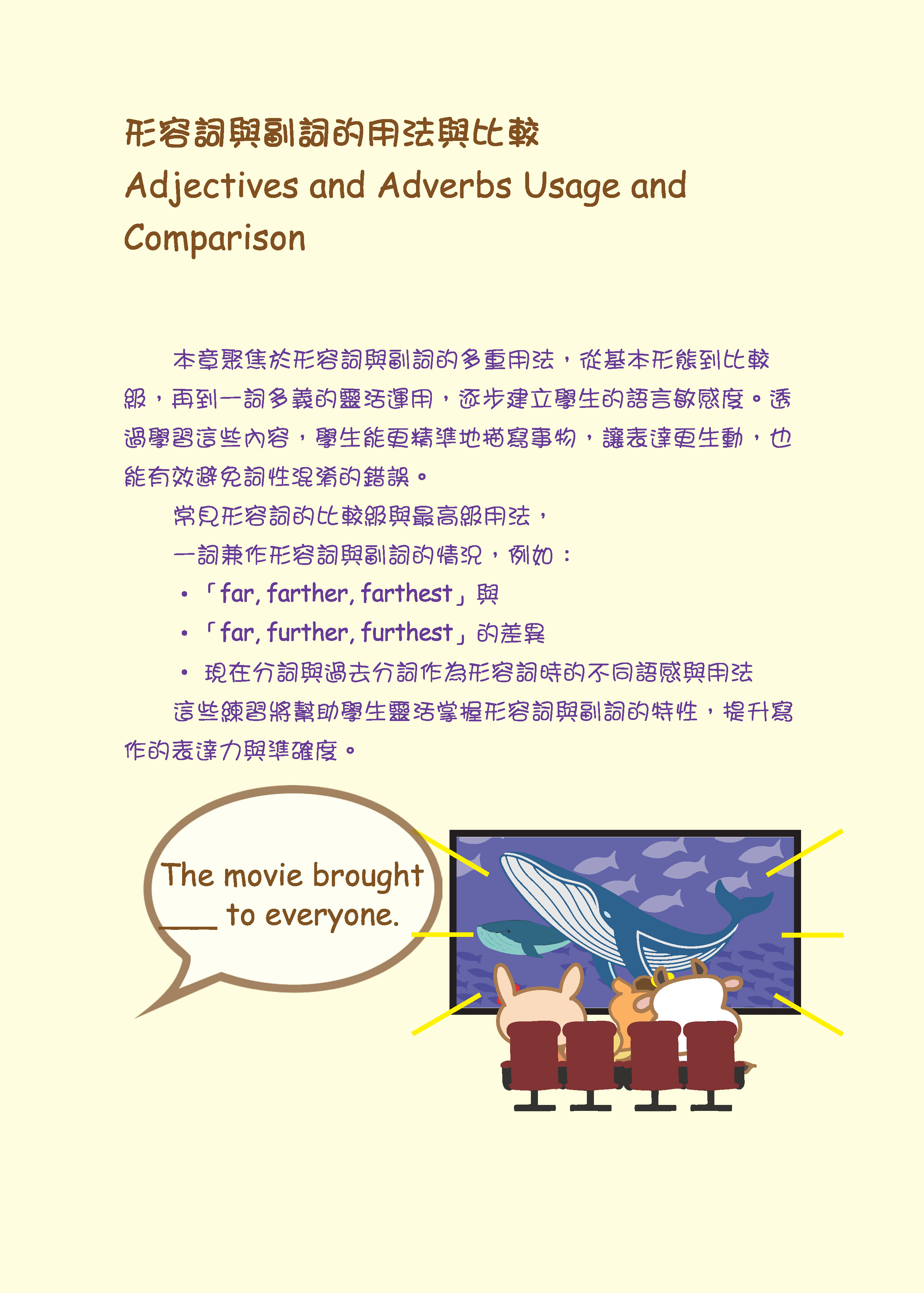 本書的特色在於:透過貼近日常生活的情境題目,讓同學能以「第一人稱」代入,實際操練時態、動詞、副詞等用法。這樣的訓練能幫助同學更清楚分辨詞性和時態,並在不同語境中正確運用詞彙,逐步建立精準的語言感。
